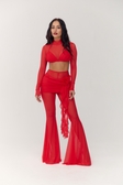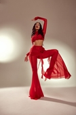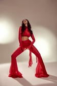 Штани клеш з драпіруванням у вигляді спідниці, топ з довгими рукавами. За рахунок зборок у вигляді бюстгальтеру, виріб з сітки не прозорий на грудях.