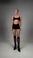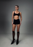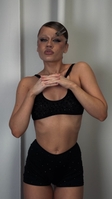 Топ виконаний з італійської еластичної сіточки та інкрустований великими скляними стразами. Предня частина топу продубльована двома шарами маетріалу, що знижує його прозорість. Виріб доповнений регульованими бретелями. Доступний в тілесному та чорному кольорах